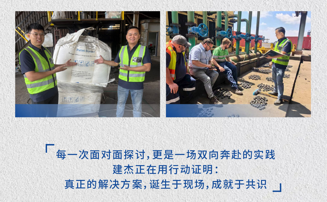在面對(duì)球團(tuán)礦客戶提出的“降低膨潤(rùn)土用量、保證強(qiáng)度不降、提升孔隙率”等一系列核心挑戰(zhàn),建杰實(shí)業(yè)技術(shù)團(tuán)隊(duì)沒(méi)有停留在理論及數(shù)據(jù)推演,而是跨越重洋,深入現(xiàn)場(chǎng),與客戶的技術(shù)專家及決策層展開(kāi)面對(duì)面、點(diǎn)對(duì)點(diǎn)的深度探討。